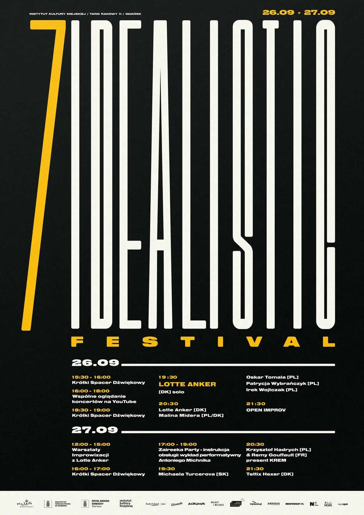 W tym roku Idealistic Festival zakotwiczył się w Instytucie Kultury Miejskiej w Gdańsku. Jest to instytucja, która powstała w wyniku ubiegania się miasta o tytuł Europejskiej Stolicy Kultury 2016. To miano powędrowało wprawdzie do Wrocławia, ale Gdańskowi na pocieszenie został między innymi IKM. Od kilkunastu lat prowadzona jest tam rozległa działalność kulturalna, a od kwietnia tego roku jej częścią jest także cykl koncertowy „Wielka Improwizacja”. W ramach takiego wydarzenia zaproszony gość albo gościni najpierw gra solo bądź z własnym zespołem, a w drugiej części występuje z lokalnymi muzykami i muzyczkami, a także animuje jam session. Postanowiono wkomponować „Wielką Improwizację” w program tegorocznego Idealistiku i okazało się to bardzo dobrym pomysłem. Pod takim hasłem przebiegł pierwszy dzień imprezy, a headlinerką była znakomita duńska improwizatorka Lotte Anker.