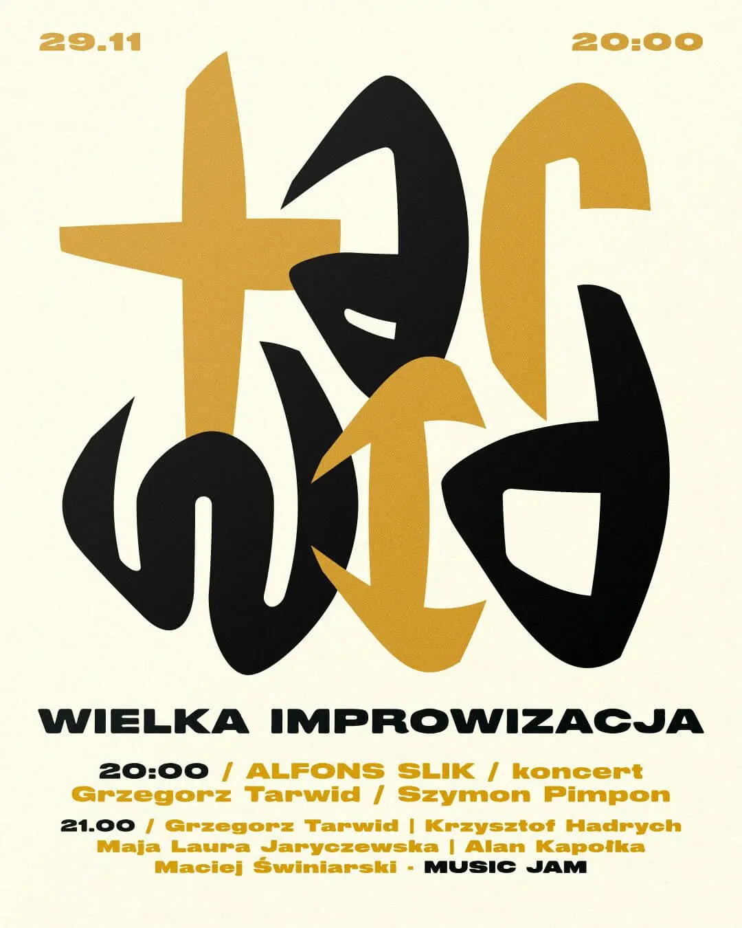 Czy w związku z tym wydarzenia w ramach cyklu są z założenia monumentalne i patetyczne? Wręcz przeciwnie. Organizatorkom z Instytutu Kultury Miejskiej, gdzie owe koncerty się odbywają, zależy, by była tam przestrzeń zarówno na skupienie na muzyce, jak i swobodę sytuacji towarzysko-artystycznej. O idei „Wielkiej Improwizacji” w IKM-ie pisałem już co nieco, relacjonując wrześniowy festiwal Idealistic, którego część także przebiegła pod tym szyldem. Mówiąc w skrócie, plan wydarzenia wygląda tak: najpierw – solo albo z zespołem – występuje główny gość bądź gościni, potem do tej osoby dołącza grupa związana z trójmiejską sceną, a w finale z grona wszystkich obecnych danego wieczoru muzyków i muzyczek tworzą się małe improwizujące składy. Koncert, którego spiritus movens był Tarwid, to szósta odsłona cyklu. Wcześniej w takiej roli wystąpili: Macio Moretti, Marcin Masecki, palestyński artysta elektroniczny Julmud, Lotte Anker z Danii i Marijus Aleksa z Litwy.
